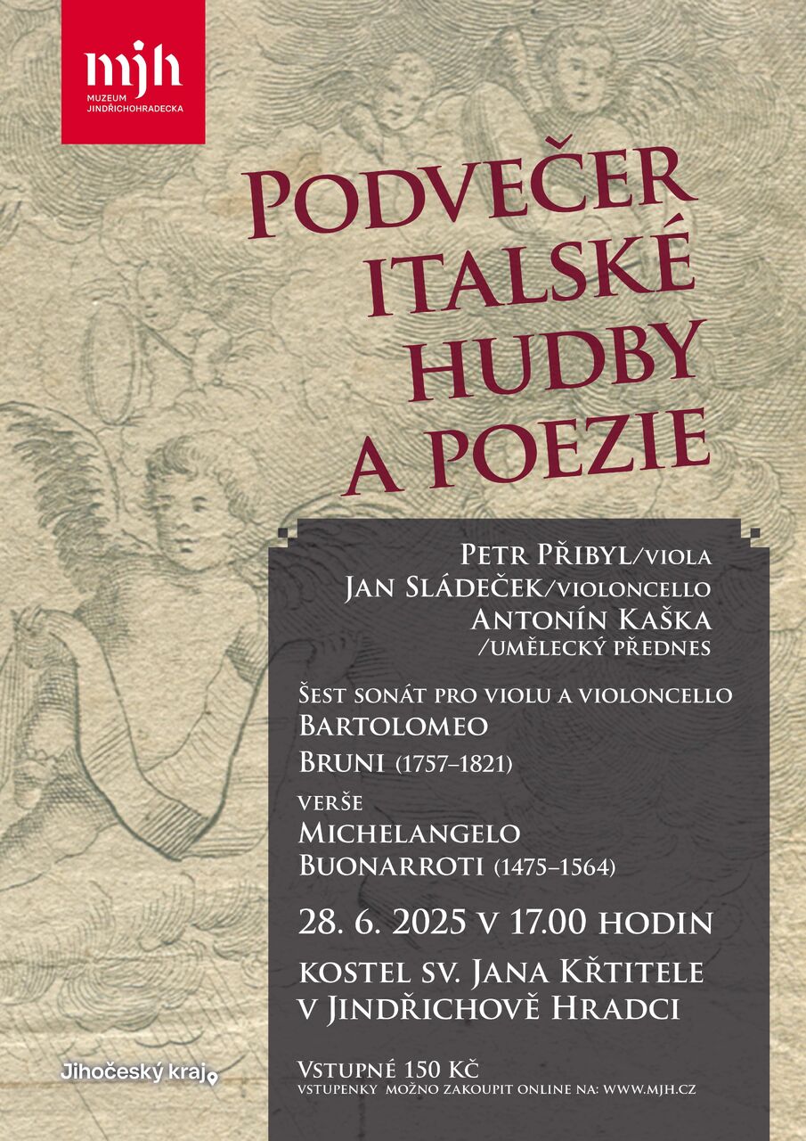 V něm se totiž v návaznosti na vernisáž můžete od 17.00 hodin těšit na Podvečer italské hudby a poezie, koncert jindřichohradeckého rodáka, violisty a hudebního skladatele Petra Přibyla, který společně s Janem Sládečkem zahraje 6 sonát pro violu a violoncello z pera italského skladatele Bartolomea Bruniho. Jednotlivé sonáty budou proloženy uměleckým přednesem veršů Michelangela Buonarrotiho v podání dalšího místního rodáka, divadelního herce Antonína Kašky.