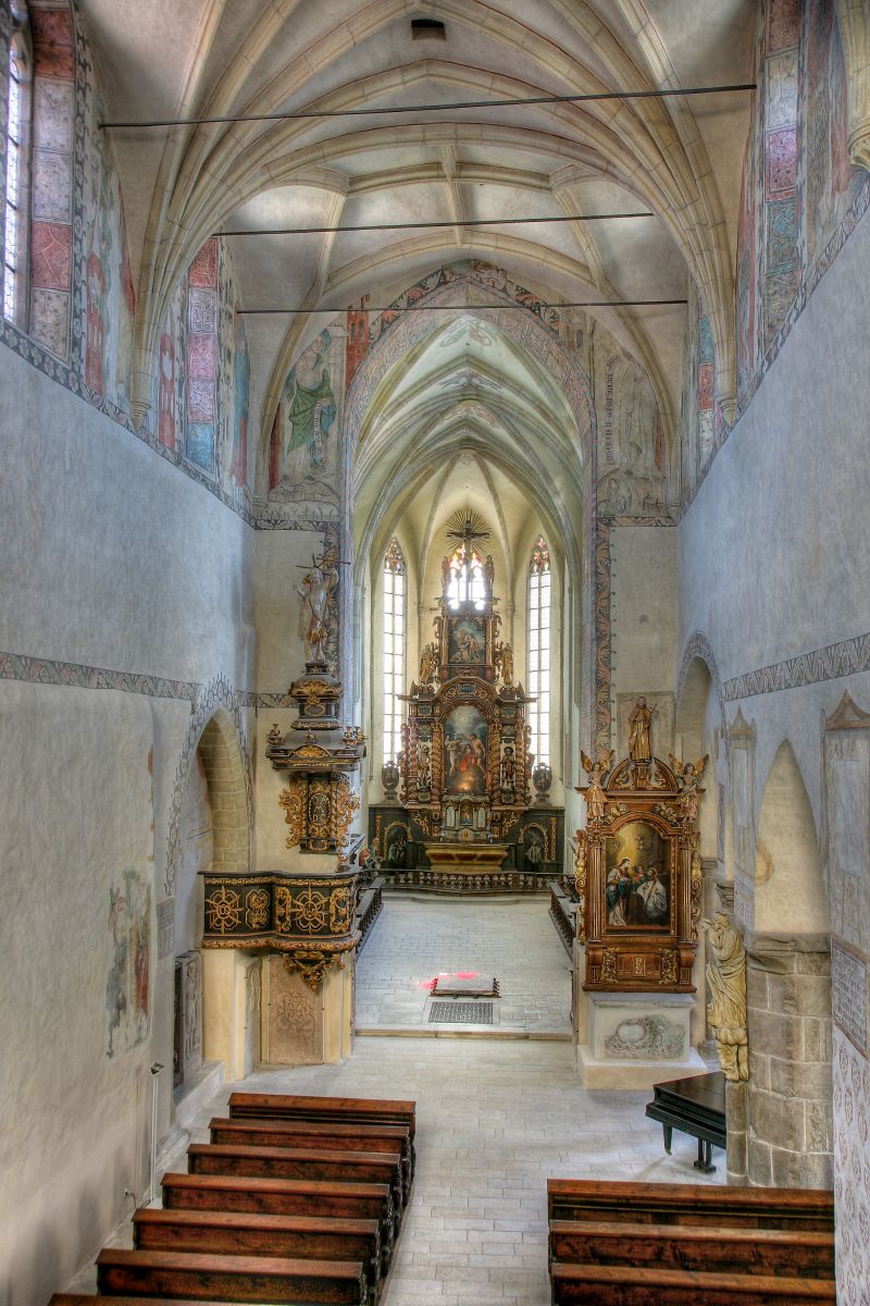 V interiéru kostela se nacházejí cenné raně barokní oltáře, renesanční a barokní lavice, kazatelna se sochou sv. Jana Křtitele a řada náhrobků. Nejkvalitnějším je pozdně gotický náhrobek Magdaleny z Gleichenu. V sakristii kostela můžete obdivovat anamorfní portrét jindřichohradeckého punčochářského mistra Tomáše Krýzy od vizuálního umělce Patrika Proška.