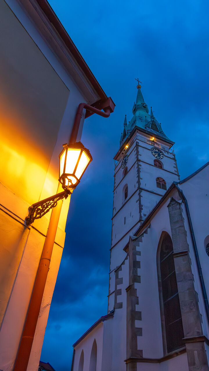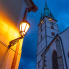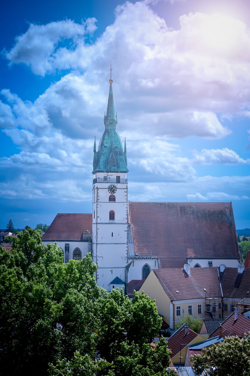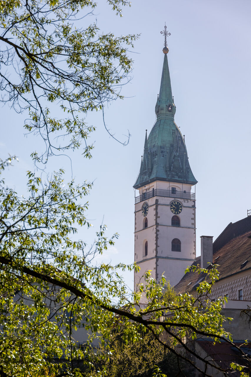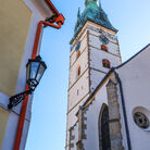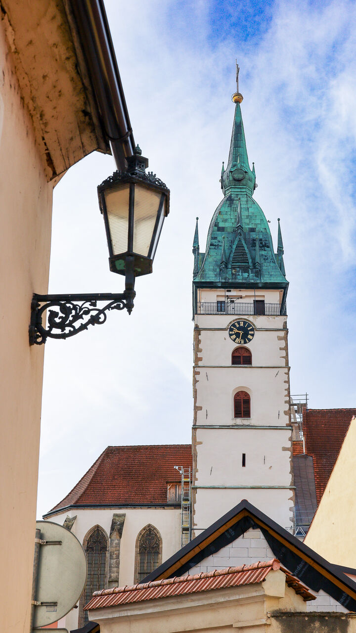 Věž u kostela Nanebevzetí Panny Marie je nejvyšší věží města, měří celkem 68,3 metru, z toho báň téměř 24 metrů. Koule na vrcholu má průměr 1,2 metru a kříž na špici je 5 metrů vysoký. Návštěvník, který vystoupí po 153 schodech až nahoru, si bude město prohlížet z výšky 35,3 metru a octne se přitom ve výšce 513 metrů nad mořem. Nárožím kostela Nanebevzetí Panny Marie prochází 15. poledník východní délky.