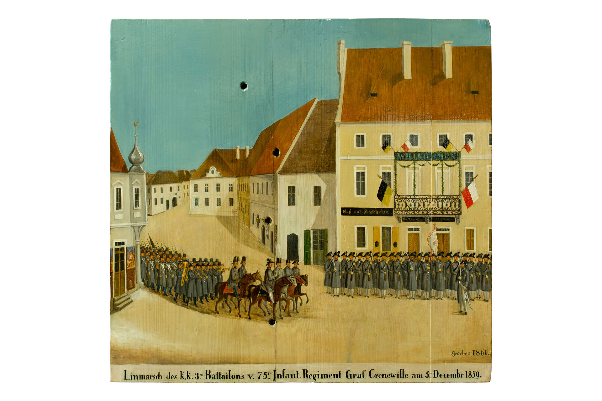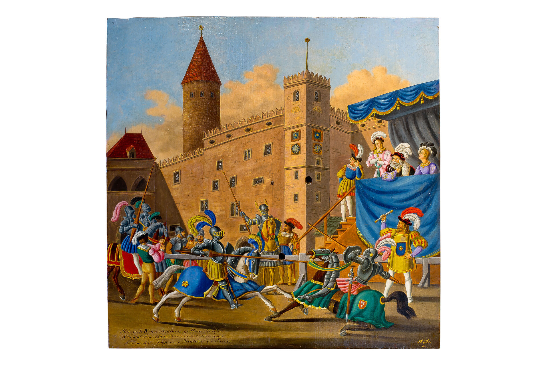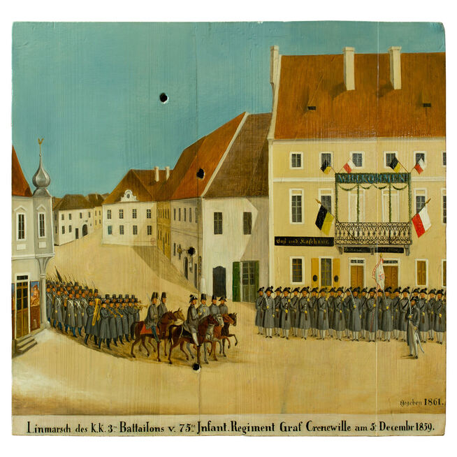 Autoři bystřických terčů a jindřichohradeckých terčů z 1. poloviny 19. století nejsou známi. Prvními známými tvůrci jindřichohradeckých terčů byli akademičtí malíři Jan See a Alois Bubák, dále malíři samouci Johann Knapp a František Holeczek. Nejvíce terčů namaloval jindřichohradecký malíř Karel Novák. Na terčích jsou často zobrazeny scény z dějin Jindřichova Hradce a ve městě sídlících rodů pánů z Hradce, Slavatů a Černínů, dále příběhy z dávné české a z novodobé evropské historie. Kromě toho se na terčích objevují zásadní okamžiky z dějin spolku jindřichohradeckých ostrostřelců, romantické krajinné motivy nebo náměty spojené s vládnoucí dynastií Habsburků.
