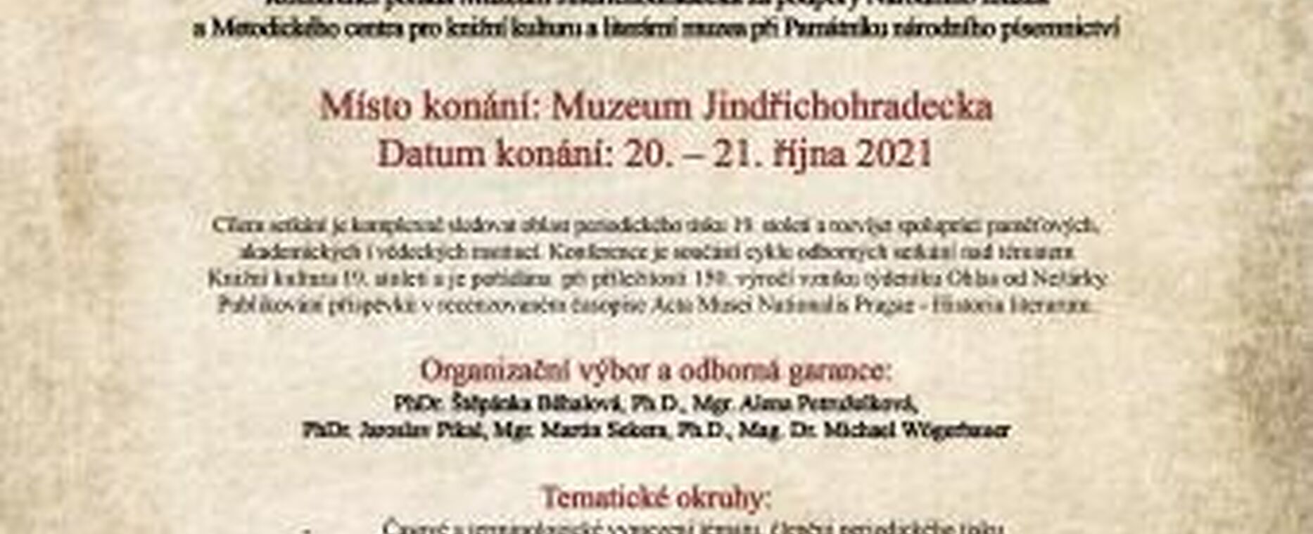 Konferenci pořádá Muzeum Jindřichohradecka za podpory Národního muzea a Památníku národního písemnictví - Muzea literatury a Sdružení knihoven České republiky ve dnech 22. - 24. října 2024 v Jindřichově Hradci.