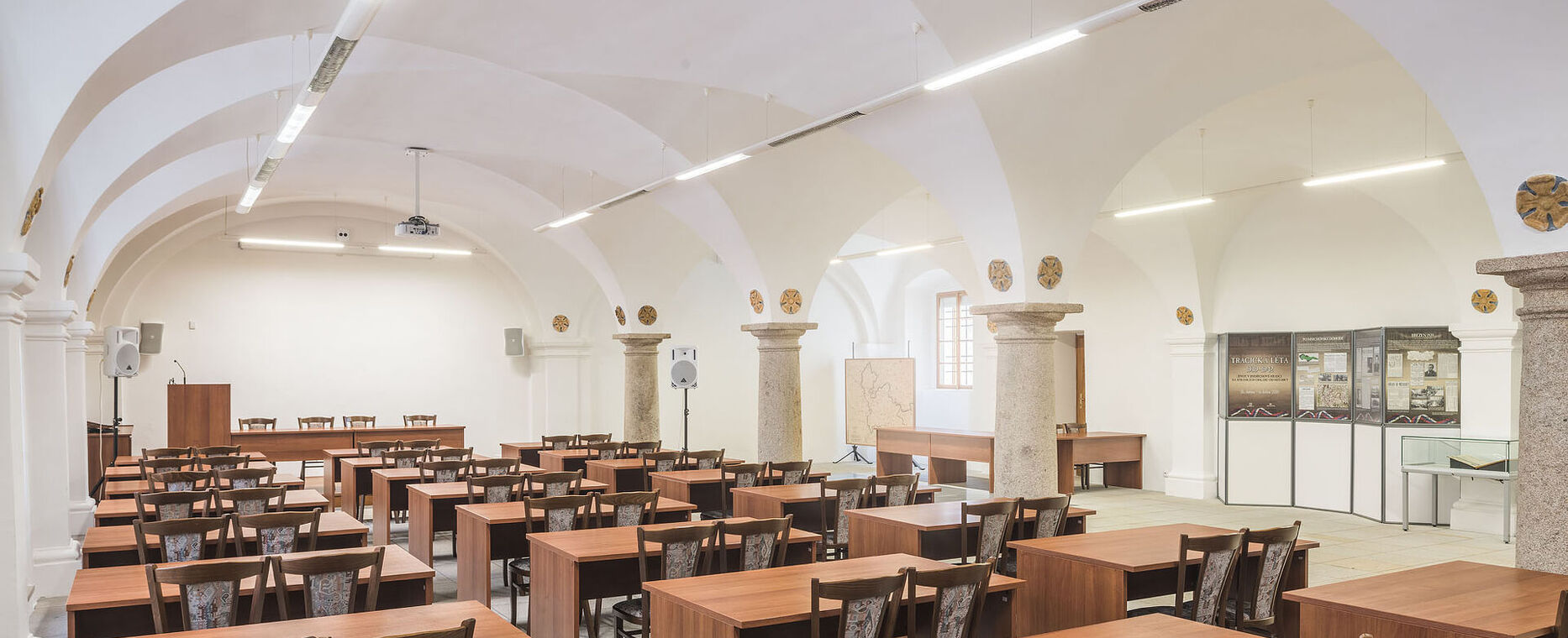 Sál nabízí při standardním uspořádání kapacitu max. 70 osob (židle a stoly).