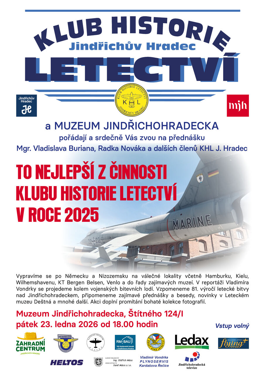Přednáška se koná v pátek 23. ledna 2026 od 18.00 hodin v konferenčním sále muzea ve Štítného ulici. Historik Vladislav Burian představí spolu se svými přáteli z klubu novinky v Leteckém muzeu Deštná, pokračování v restaurování repliky letounu Spitfire z filmu Tmavomodrý svět, průběh zahraniční expedice klubu po Německu, pietu k 81. výročí letecké bitvy nad Jindřichohradeckem z 24. srpna 1944 a řadu dalších akcí, které pro veřejnost klub vloni připravil. Součástí akce bude bohatá prezentace fotografií a filmových dokumentů. Vstup je zdarma.