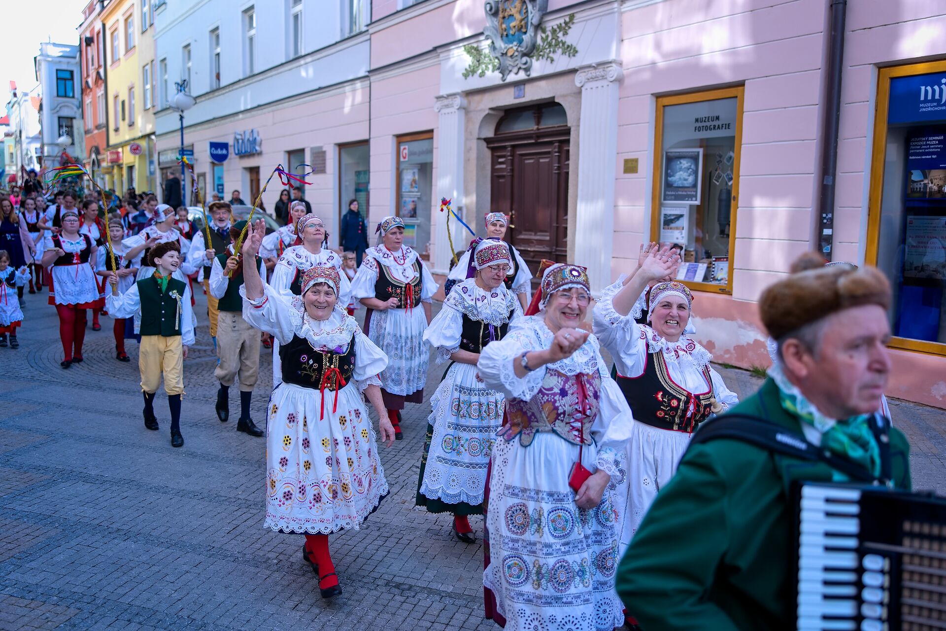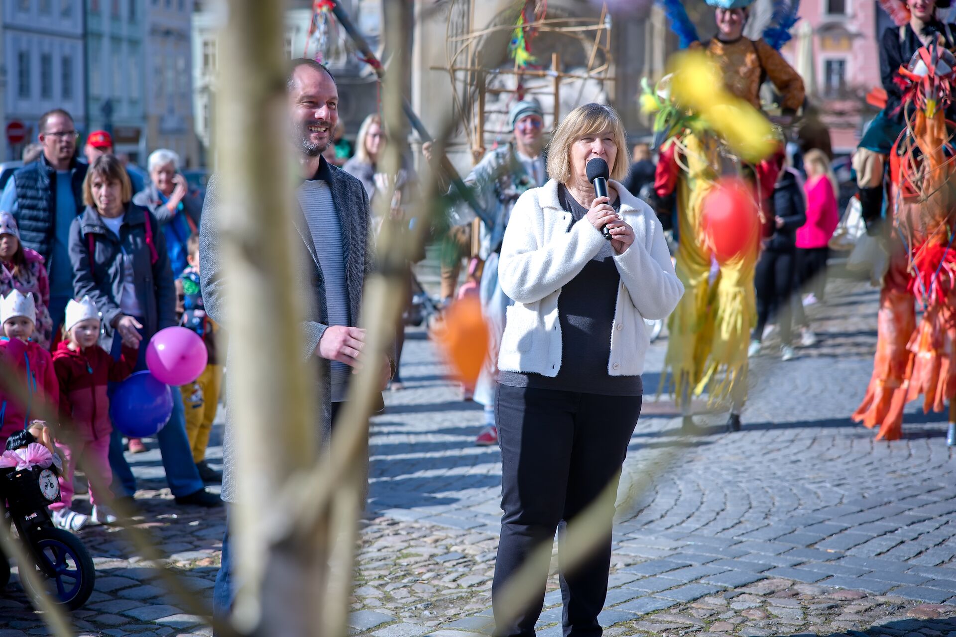 Ten vyrazí v 9:30 od budovy muzea ve Štítného ulici (řehtačky vítány) s nazdobeným Kraslicovníkem. Veselé procesí v čele s dětským rytmickým souborem Hakuna Matata zamíří do Panské ulice a na náměstí Míru, kde se představí také členové Divadla Studna se svými pestrobarevnými okřídlenci na chůdách. Chybět ani letos nebude Krojová družina z Jarošova nad Nežárkou. Vyvrcholením průvodu bude usazení nazdobeného Kraslicovníku na náměstí Míru za doprovodu bubnů, zpěvu a tance.