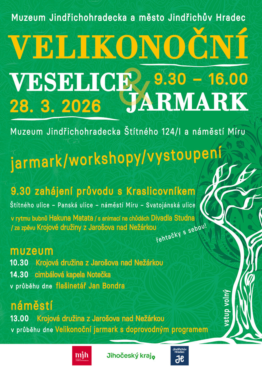 Velikonoční veselici pořádá Muzeum Jindřichohradecka ve spolupráci s městem Jindřichův Hradec, které připravilo na náměstí Míru celodenní Velikonoční jarmark. V rámci Velikonočního jarmarku si budete moci zakoupit velikonoční dekorace a pomlázky, ochutnat zelené pivo,a hlavně si pochutnat – na své si přijdou milovníci slaných jídel i sladkých dobrot, takže si můžete dát jak poctivý oběd, tak i něco dobrého ke kávě.