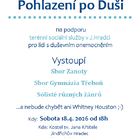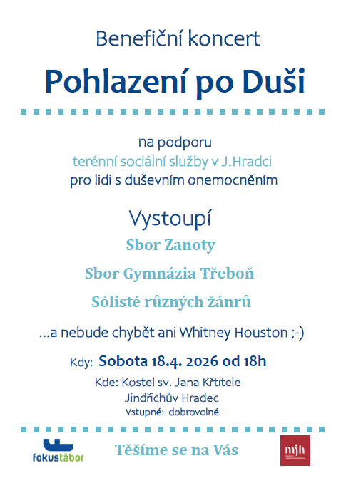 Koncert Pohlazení po Duši bude žánrově pestrý. Vystoupí na něm dva pěvecké sbory (Sbor Zanoty GVN V. Nováka v J. Hradci a Sbor Gymnázia Třeboň), a také několik pěveckých sólistů. „Určitě se máte na co těšit. Jsem milovnicí hudby v kostele a miluji sborový zpěv. Z tohoto důvodu mám velkou radost, že mé pozvání přijaly hned dva pěvecké sbory. Jedním z nich bude školní sbor místního gymnázia Zanoty a druhým bude sbor třeboňského gymnázia. Oba sbory doplní několik sólových zpěváků. Jejich jména Vám nyní neprozradím, ale s radostí oznamuji, že mezi sólisty určitě nebude chybět kopie Whitney Houston,“ dodává s úsměvem pořadatelka akce a zároveň vedoucí jindřichohradeckého pracoviště Jaroslava Paštiková. Vstupné na benefiční koncert je dobrovolné. Všichni jste srdečně zváni.